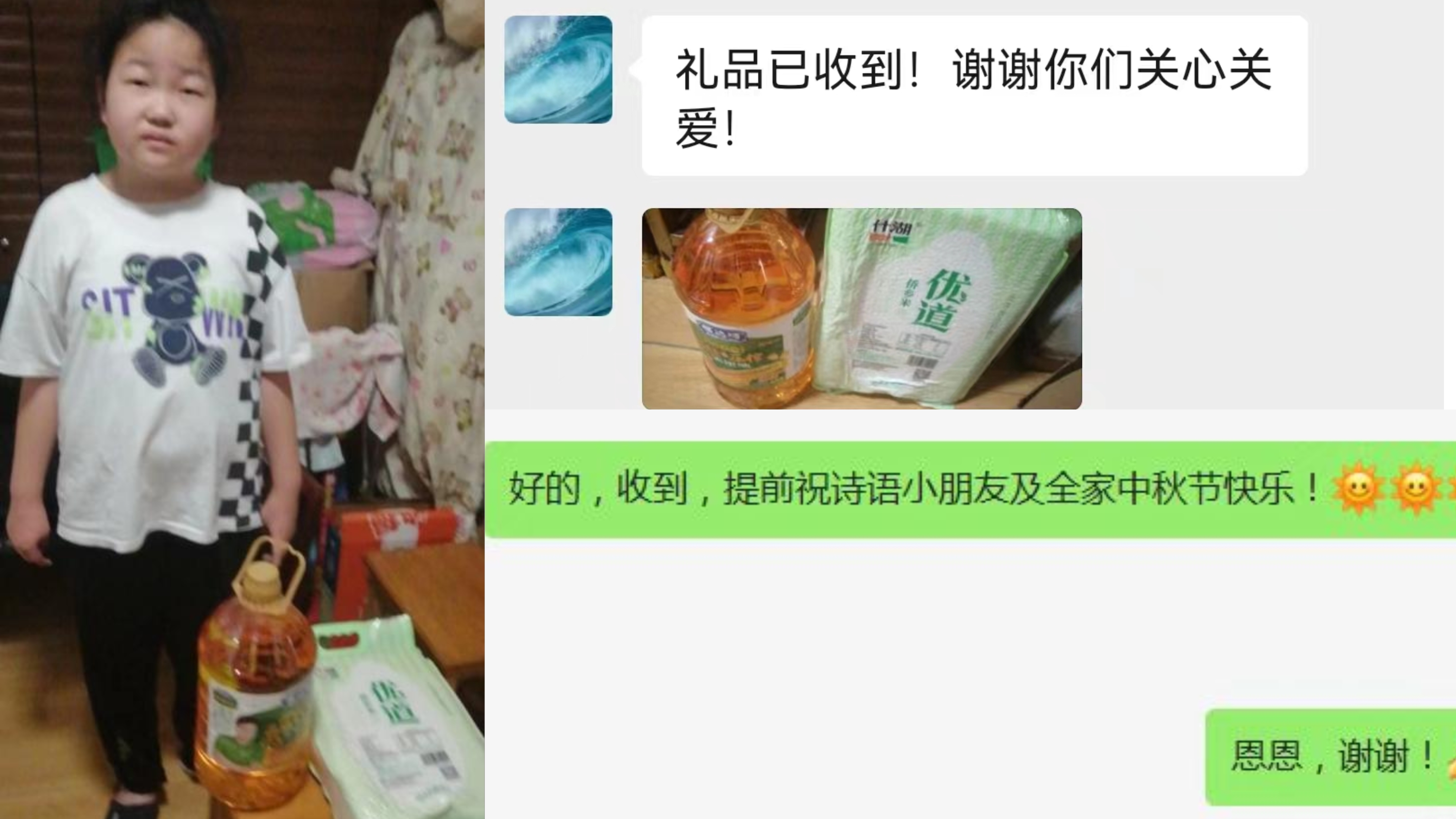 中秋來臨之際,東信醫(yī)藥為青年文明號扶貧結(jié)對對象劉詩語小朋友準(zhǔn)備了米、油等中秋物資。因疫情原因,物資通過快遞的方式為她送出。