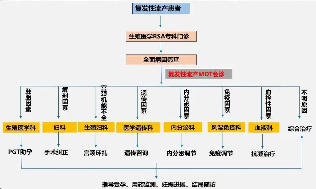 復(fù)發(fā)性流產(chǎn)病因復(fù)雜,涉及多學(xué)科且缺乏特異性臨床表現(xiàn),需要孕前、孕期甚至孕后的全程管理,所以聯(lián)合以上多個科室專家診療才能獲得全面、系統(tǒng)、高效的診療效果。多學(xué)科聯(lián)合會診(Multidisciplinary Team,MDT)的目的正是將各學(xué)科專家集合在一起,針對患者情況進行集中討論,制定出一個完善、全面的治療方案。