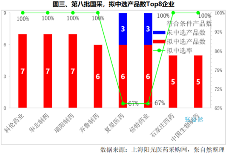 本土藥企科倫藥業(yè)、華北制藥和山東瑞陽制藥擬中選產品數(shù)量并列第一,都有7個產品中選。齊魯制藥、復星醫(yī)藥和倍特藥業(yè)并列第二,都有6個產品中選。石家莊四藥和中國生物制藥都中選了5個。其中,復星醫(yī)藥和倍特藥業(yè)各有3個產品落標,中選率67%,其余6家企業(yè)的產品悉數(shù)擬中選。