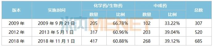 表1:最近三版國家基藥目錄的品種情況