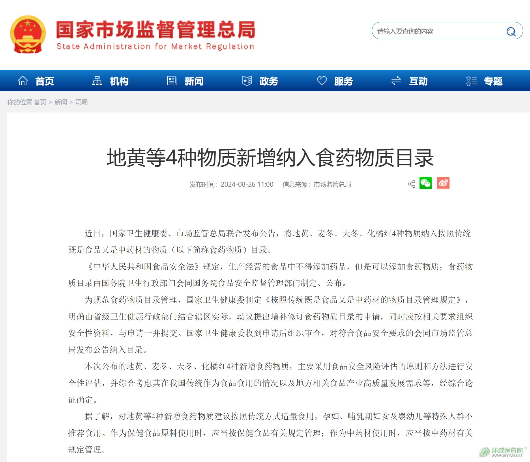 8月26,國(guó)家衛(wèi)生健康委、市場(chǎng)監(jiān)管總局聯(lián)合發(fā)布公告,將地黃、麥冬、天冬、化橘紅4種物質(zhì)納入按照傳統(tǒng)既是食品又是中藥材的物質(zhì)目錄。據(jù)了解,對(duì)地黃等4種新增食藥物質(zhì)建議按照傳統(tǒng)方式適量食用,孕婦、哺乳期婦女及嬰幼兒等特殊人群不推薦食用。作為保健食品原料使用時(shí),應(yīng)當(dāng)按保健食品有關(guān)規(guī)定管理;作為中藥材使用時(shí),應(yīng)當(dāng)按中藥材有關(guān)規(guī)定管理。