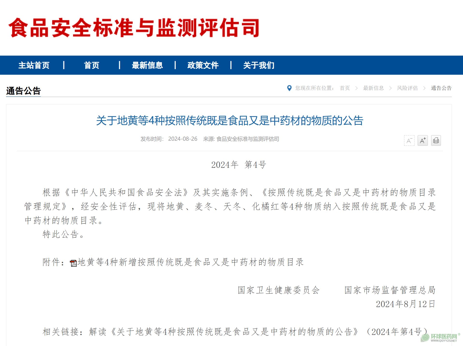 解讀《關(guān)于地黃等4種按照傳統(tǒng)既是食品又是中藥材的物質(zhì)的公告》(2024年第4號(hào))